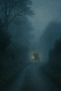 Alt text (suggested): Country lane at dusk; faint suggestion of a horse‑drawn coach in drifting mist.