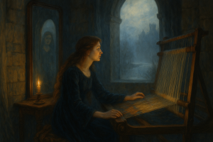 The mists of dawn coil around the riverbanks, where willows dip their branches into silver water. Within her tower, the Lady of Shalott sits before her loom, the rhythmic clatter of the shuttle her only company. By some ancient enchantment she is bound: she may see the world only through the reflection of a mirror, weaving its shifting images into her endless tapestry.